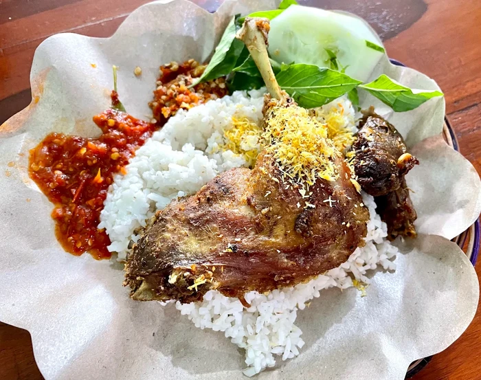 Menu ini dilengkapi serundeng, sambal, dan lalapan segar. Satu porsi nasi bebek plus es jeruk segar dibanderol sekitar Rp 30.000-an.