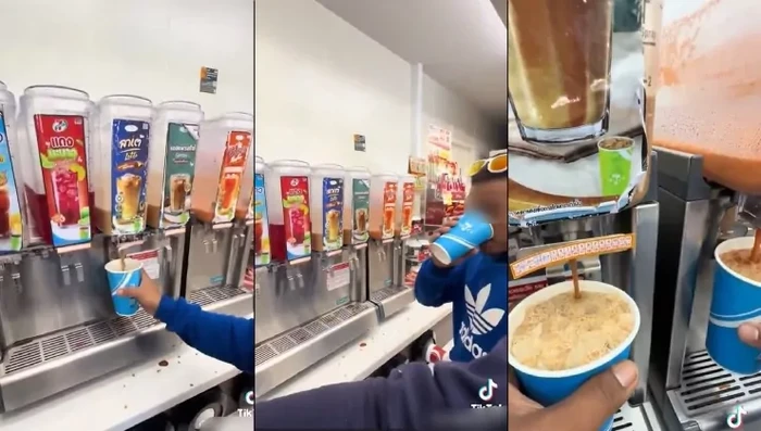 Setelah diminum, ia kembali mengisi ulang minuman tersebut dari mesin yang sama, bahkan mencampurnya dengan varian rasa lain. Aksi serupa juga dilakukan oleh perekam video dan beberapa rekannya.