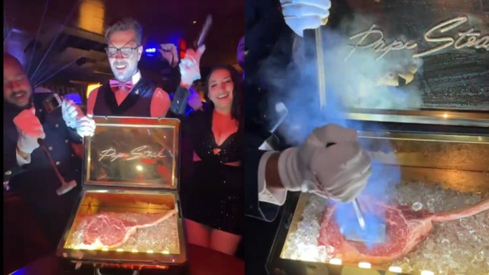 Pertunjukannya melibatkan tarian, teriakan, dan confetti. Di dalam koper besi sudah ada steak tomahawk mentah yang disiapkan. Ketika koper dibuka staf lain datang untuk menekan alat panas berlogoi ‘Papi Steak’ ke atas daging steak untuk mencetak logonya.