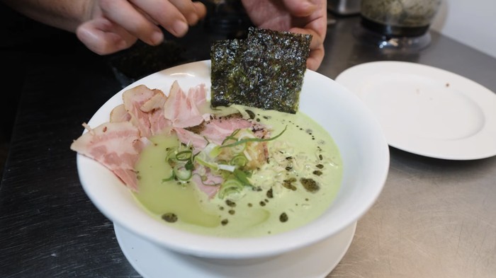 Keunikan hidangan juga terletak pada tambahan nori oil, minyak gurih bercita rasa umami dari pemakaian lembaran nori (rumput laut). Dirty Chef lalu menambahkan bubuk matcha sebagai rasa kaldu mi instan.