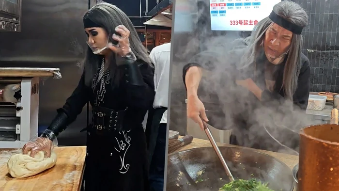Selain itu ada pegawai yang berperan sebagai Mei Chaofeng, karakter antagonis yang terkenal dengan jurus mematikan ‘sembilan cakar tulang yin’. Lalu ada juga yang berperan sebagai Ke Zhen’e, tokoh buta dalam kisah tersebut yang memasak dengan mata tertutup.