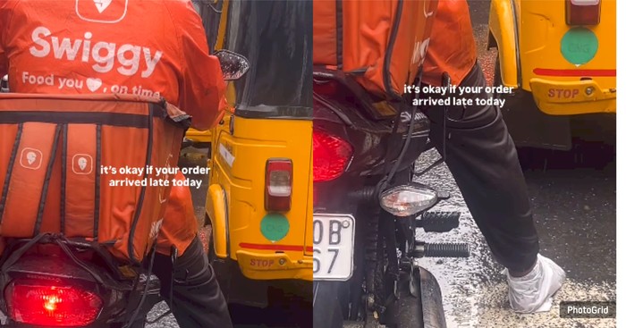 Video pendek itu diunggah oleh pengguna Instagram bernama Khushi. Dalam klip tersebut, terlihat pengantar makanan dari perusahaan Swiggy mengenakan jaket hujan oranye dan helm.