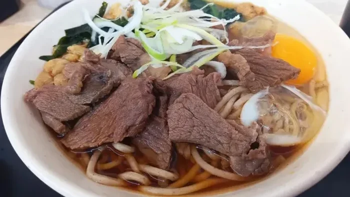 Semangkuk soba tersebut tampak berisi irisan daging beruang yang cukup tebal, dilengkapi remahan tempura, sayuran hijau, telur yang dimasak langsung di kuah, serta taburan daun bawang.